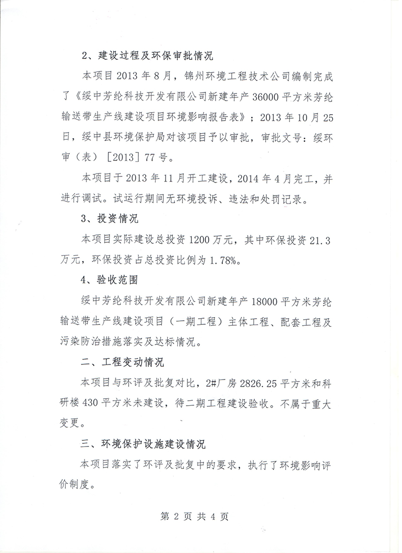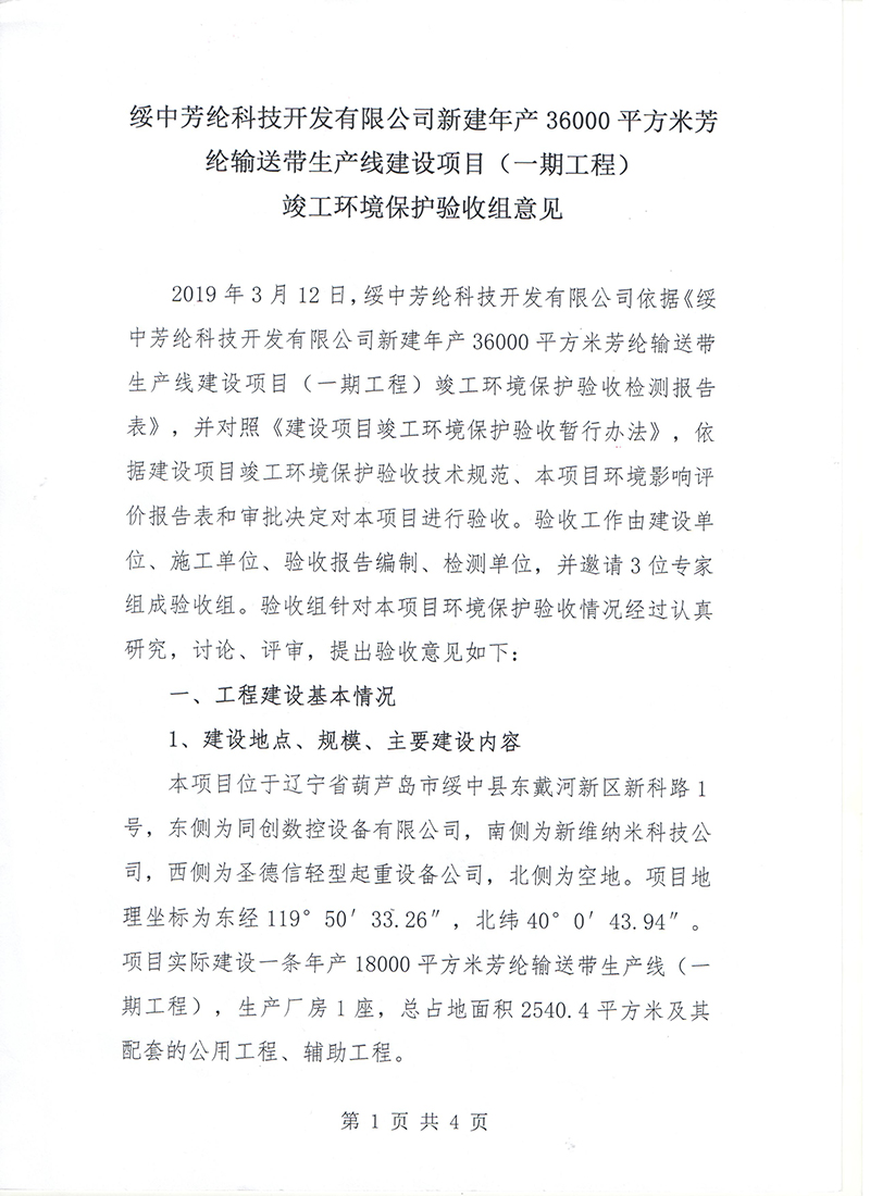 綏中芳綸科技開發有限公司新建年產36000平方米芳綸輸送帶生產線建設項目(一期工程)竣工環境保護驗收組意見